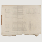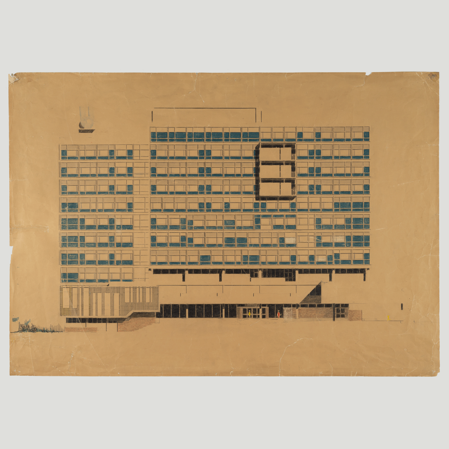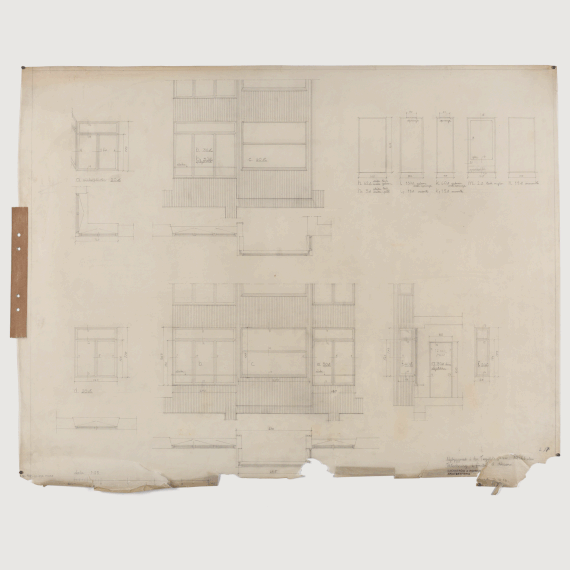 One of the more time-consuming objects has been a drawing of a sliding window1 from the collection of architects Sven Backström and Leif Reinius. At the start of the work, it was yellowed and dirty with many tears. Now, after careful repairs, the drawing is in its best condition in a long time. Every tear has been painstakingly repaired, where parts were missing, new sections of paper have been inserted to prevent further tearing. To flatten the wavy drawing, the entire sheet is humidified and pressed according to all the rules of conservation.